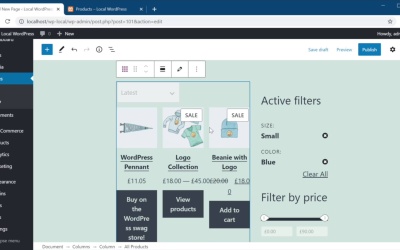 Welcome back to the course, in this lesson, you'll learn how to create a custom shop page in WooCommerce by using the new blocks I showed you previously. This is super simple to do. So let's begin. Now by default, WooCommerce creates this shop page that you can see here. And that looks something like this, in here you basically get a list of all the products with pagination and also some sorting options. But what if you want to make this look different and use your own custom templates in doing that? Well, let's go ahead and create our own custom shop page using the new blocks. So I'm gonna click add new, I'm gonna name it Custom shop. And I'm gonna create a two column layout in here. So, I'm gonna select Columns. And I'm gonna do let's say a 70, 30 split, which means one large column here and one smaller column here. So let's go ahead and add a block to this. We'll browse, To the WooCommerce blocks and we'll select active product filters. Let's add a new one. Let's search for filter, filter products by price, and let's add the new one, filter products by attributes, and we'll select and we'll hit done right here. And actually this was not placed in the correct place, sorry about that. Let's do that again, let's add the block right here. So filter by attributes. Attribute, select color here and hit Done. Okay, so that is our sidebar in here. Let's go ahead and add all products. And that's gonna display all my WooCommerce products along with a drop down for sorting the products as well as a pagination. So, let's go ahead and publish this and let's view it. Now this is now our Custom shop page. This might look a little bit too crammed in here because the page template that I use just allows for this tiny container here in the middle for the content. But when you're working with your own theme then you can quickly create a page template that will accommodate this much better. But as you can see, the functionality is exactly the same as you would expect on your normal shop page. You can filter these. You can clear filters, you can filter these by color. Super simple and you can open them up, just like so. Now if you would like to use this page as the default shop page, you will need to go back into your WordPress Admin, go to WooCommerce, settings and under the products where it says Shop page, you will select Custom shop. Save changes, and now whenever you'll be opening up the shop page, this one will be opened instead of the default one created by WooCommerce. All right and that's how we can create a Custom shop page using the new WooCommerce blocks. Now there are a few more blocks I haven't showed you because they are not yet included in the WooCommerce core. Those are available separately as a plugin, and you can use them to create a custom cart and checkout page. And I'll show you how to do that in the next lesson. So I'll see you there.