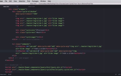 In this lesson, you'll learn about commands, and these are instructions you can pass to use cycle slideshows after initialization. There are ten in total. So let's begin. To show you these commands, I'm going to create a container for them. So UL What a class of commands and each command will be triggered by a button inside a list start up now the first command is called ad and its purpose is to add one or more slides to a slide show. So let's say a slide and we're going to give it an ID of COM from command at and let's give it some styling. For styling, nothing fancy, some margin. Set the padding to zero. And said the list-items to inline block. So they're all displayed on a single row. So now the commands will be right here. Now you can issue a command in two ways. Either via markup Using data attributes or in JavaScript and I'm going to show you both ways for two of these buttons, but for the rest we're going to stick with the markup version. So to add the slide via markup. We're going to do this we're going to say data Cycle CMD for Command. We're going to say add the name of the command and then that a cycle, ARG is going to be as follows. So, we're doing the command name and the arguments and the argument is going to be an image. We're going to replace the double quotes with single quotes, the SRC. Let's go to your master I N G slide .Jpeg. alter is going to be slight image and let's check it out. Currently we have one, two, three, four, images add one and we have five. Images. While the fifth one is a replica of the second image And we can had as many of these images as we want. Of course, when we refresh the page, those images will be gone, so that is the mark up method. To do the same thing in JavaScript, we would do the following. Declare a script, we'll say function. We'll declare a variable called slideshow and will target our cycle slide-show. And then we're going to target our command button, on click. We're going to say E prevent the faults, and then we're going to declare a variable called new image that's going to have the same S.R.C., as we did here. So basically we're going to copy this like that and then we'll say slide show cycle at so we pass in the name of the command and the argument which is new image. So now if we didn't have these attributes here, we can still achieve the exact same effect using JavaScript. But, for now, we're gonna keep those in the HTML, and we're gonna comment this bit. So, now that we have a starting point, let's move on with the next command, and the next one is called destroy. And what it's doing, it's basically destroying the instance of the slideshow, the instance of cycle. So, we're gonna say com. Destroy the command will be destroyed and we don't have any kind of parameters. We're gonna say here destroy slideshow. So if I click this it's gone. I just have like normal markup here. I cannot add a slide anymore because I don't have a A cycle instance is just gone. The next two buttons are for previous and next. So let's copy those. I'm going to have com next. That's the command. We're going to say next slide and this will be previous. The command is prev, previous slide. Tried again next, next, next, previous, previous it's the same action as These two buttons here. Now if you want you can also add this functionality in JavaScript. So for example let's say on the next Button. Now let's remove that and I'm gonna copy that but I'm gonna say com-next click function (e) we don't need this bit anymore. Instead what we're gonna do is say slideshow Cycle "next". Just like that. And now it still works as expected. So that's how you create or give these commands from javascript let's move on. The next command is called Go To and this will transition the slide show to a particular slide. You would say data cycle command Go To an argument. I put two here for slide with the index to. So that is the third slide now so if we go to slide. Let's go here. Go and it takes us to the third slide. We have five commands left. And they are as follows, pause, which will pause the sideshow, so currently it's all running, I pause it, then we have resume, and the command is resume, will resume a paused sideshow. Next we have stop the command is stop. It will simply stop the slide show. It doesn't matter if we click resume now, it's not going to work because it's not paused it's stopped. The next one is called reinitialize slide show. Now reinitialize slide show is the equivalent of giving the destroy command and then Re-initializing cycle. Now so it's basically a refresh. Now you should notice that adding a slide here and then hitting the reinitialize will keep that slide or both slides as you can see here because they are added in the markup. Now if I do destroy and then I do reinitialize, it doesn't work So just keep that in mind. And finally remove a slide has the command of remove or go and you passon zero based in the X. of the slide in our case is zero means remove the first slide. So if we have a running slide show remove one remove, remove until there is nothing left. That's it for commands. Now a huge part of the cycle A.P.I. is represented by events. We'll have a look at those in the next lesson.