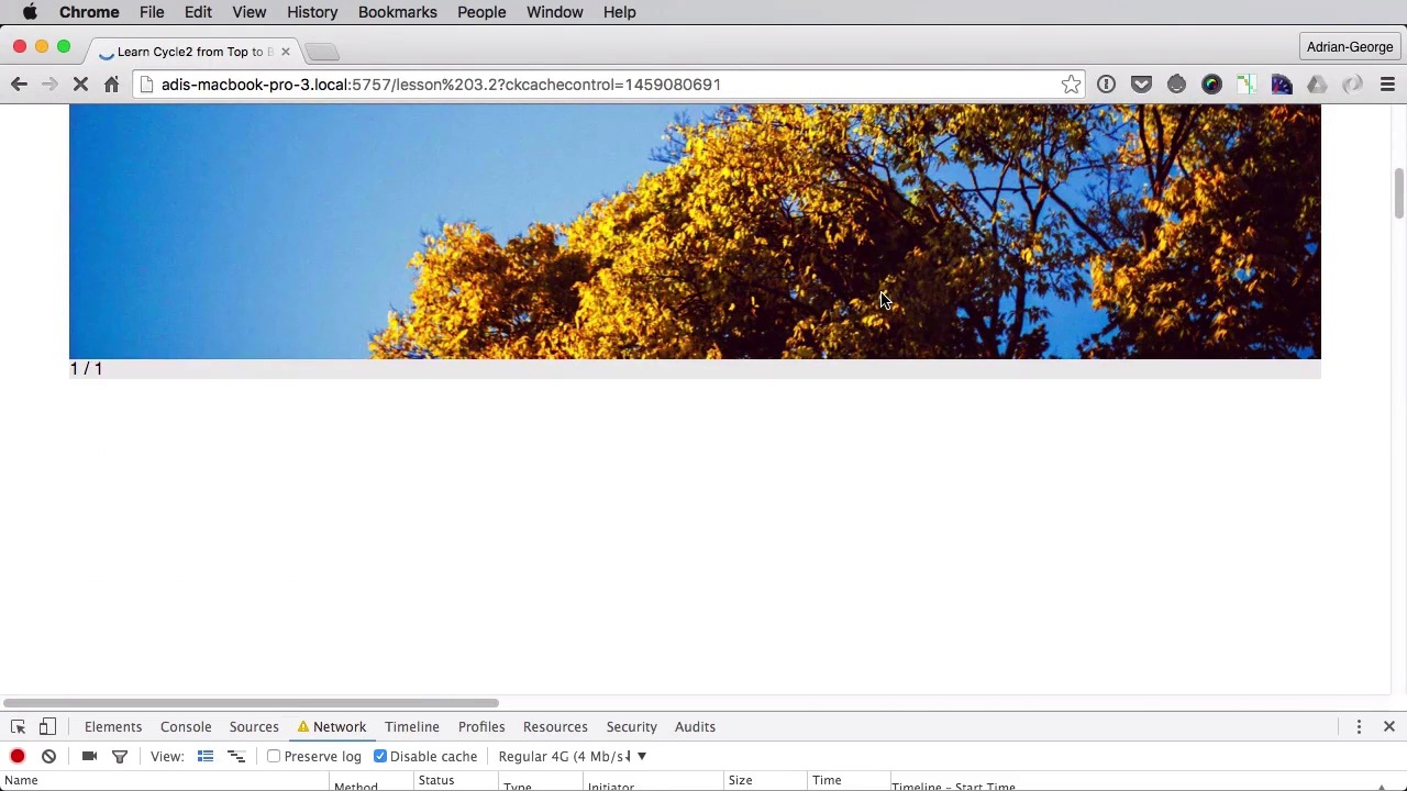 Your typical slide show will contain images, and as we know images represent the biggest or the heaviest parts of any web page. Now what happens if you have a really slow internet connection. What happens if the slider gets initialized, but the images are not loaded just yet. Well let's find out. To find out, let's simulate a very slow connection from Chrome. So if you're using Chrome, you can go to inspect, you can go to Network. And here you can see throttling, and we're going to set this to be a regular 3G connection, right. So set this, let's make this just a tiny bit smaller. And let's do a refresh. Now in order for this to work, we need images that are hosted elsewhere not on our local machine. So, I'm just going to update the src's here. So I have some images on my GitHub page, plus I added a caption. If we do a refresh, you can already see how it looks. Here the images just barely, barely download, and you can see that the slideshow is changing slides without the images even being downloaded first right, so this is an on wanted behavior this is why you can use an image loader now cycle has an option called data cycle loader by default it's turned off. But you can enable it, and you can set two values for it you can either set true or you can set the wait. And let's see what happens, if we set this to true first. So right here, we're gonna say data-cycle-loader equals true, right. Now let's save this and go back here sets the throttling again, do network. Let's do like good 3G regular 4G. Let's try with regular 4G for now, see if we get the desired result. Still refresh. Yeah. So, it's currently downloading the images, but as you can see there is no slider being shown just yet, because we don't have the images yet. Okay, there we go. So, I don't know if you saw that, it was kind of fast. Maybe you can just rewind. But It got the first image. Then it got another one, and another one, and it updated the slide count afterwards. Right, so let's actually try this with a slower connection and see if you can see this better. So, this is going to take a while. I'm just going to fast forward here, until we can see a result. And you'll see how this this option will simply load, when two images have downloaded, and then it's going to show the slide show, and then it's going to download the other images. So one by one, here we go, one out of one, one of a two, three, and four. Now, so this was a bit clearer I hope. Yeah, so this is what loader troop is doing. Now, you need to be aware, because when using the loader true because images are added to the slide show as they are downloaded, they might not be displayed in their natural order. In the order, you set them in HTML. But using the option will guarantee that the slide show will be initialized as soon as two of the slides are available. So that's option one option two is called wait. So instead of true we're going to set this to wait. Now wait will essentially wait for all of the images to download all of the slides to be ready. That ensures that all of the slides will be displayed in their correct order, in the order you set in the HTML right. So I set this to wait and let's actually get a faster connection here and let's do a refresh. And now it's going to take a while, but it's going to download, or it's going to initialize the slide show after everything is loaded so. Any moment now, and there you go. The slider with all four slides loaded at once. So those are the two options. Wait and true. And that's it for cycles loader option. Really handy when it comes to working with images. Now another option that's really handy when working with images is called progressive loading, and you'll learn about that in the next lesson.