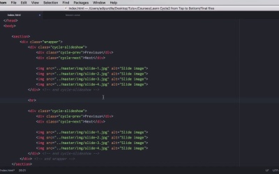 The slideshows you've seen so far are automatic. That means they change the slides automatically. But what if you want a bit more control? What if you want some controls that allow you to change slides by hand, like a Previous or a Next button? Well, that is totally doable, so let's find out how. Just like with captions, the easiest way to add navigation controls is to use an element with a predefined class inside the slideshow element. In our case, the element, or the elements, because there are two of them, will be two divs with the class of cycle-prev and cycle-next, like this. Now if we're gonna take a look here, you'll see that we don't have any content for them and that's because you need to add your own content. So in my case, I'm just gonna say Previous. I'll use text, but you can use whatever you want even icons, and Next. So now, these two are here. I can click on them and the plugin will go either backwards or forwards. Now you can customize these however you want. For example, you can add a background color, padding. You can position them absolutely like I did here. Set the top to 50% and set the margin top to -5m, so they're positioned right in the middle. Set a z-index so they're above all of the images. Cursor, just a hover state here and then put the previous to the left and the next one to the right. So now they look like this, right? There we go. Next, next, next. Of course we can add down states if you want. It's not necessary in our case here. Now you can also create custom navigation controls. So just in case you don't want to use these two classes or the elements inside a slideshow, right, you can create your own. Let's duplicate this and let's add a symbol separator here. So we're gonna delete these two and we're gonna create a control outside. We're gonna say div with a class of controls and inside we're gonna have two anchor tags, one with a class of prev, doesn't matter what you put in the href. It's gonna get overwritten anyway. Let's put an arrow to the left and say Previous, and we're gonna copy this, and we're gonna say Next. We're gonna put an arrow to the right and the class will be next. Now these classes here, prev and next, they don't have to be prev and next, you can put whatever you want in there, right? And what you've got to do now is go to your slideshow and you gotta send data-cycle-prev. And you would do the jQuery selector again and select the class of prev. Do the same for next like that. And now you have the second slideshow which uses these controls. And of course you can create new styles for these. You can, for example, align them to the center. You can maybe add a padding and maybe add a margin to the anchor text. So it looks like this. The cool thing about using this method is that you can put these controls anywhere you want in the page. They don't have to be siblings or descendants of the slideshow. You can put them above if you want, and they're still going to work. And that's how you can use navigation options or previous-next controls to control when your slides will be switched. Now, the transition that you saw in the slideshows so far is a simple fade transition, but there are a few more you can use. So you'll be learning about those and more in the next lesson.