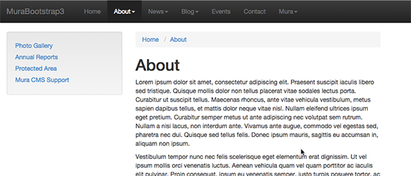 Mura has the ability to create different display regions for users to add content from within the site manager. For example, if a user wanted to add a sub navigation to a folder, they would select the Sub Navigation object and add that to the “Left” Display Region on the page.