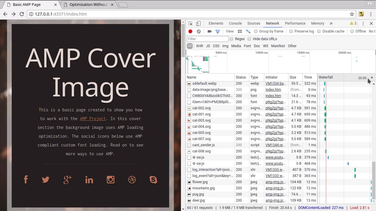 Hey, welcome back to Optimize your Website without AMP. In this lesson, we're gonna go through and have a look at what we're gonna making in this course. So I wanted to make sure that the techniques that we're gonna go through in this course compare to AMP on a one to one level. And I think to establish that a set of optimization techniques can step against AMP, which is very good at optimization. The best way to do that is to take a site that's already been built in AMP. And then rebuild it without AMP with all the same types of content included. And see if it can be made to load as fast or maybe even a little bit faster than the AMP site. So this here that you're seeing right now, is the site that we built in another course called Up and Running with AMP. So it comprises of this cover section here. We have a big background image filling this cover section. We've got some icons, then below here we have a YouTube video. We have a CodePen embedded to show how working with iFrames works. And then we have a gallery. And if you click on the gallery items, you get a lightbox. And then finally at the bottom, we have three embedded tweets. And those tweets are turned into a carousel. And that's all using the different AMP custom elements. So that is our original AMP site, this is the same site rebuilt but optimized without amp. So, once again, we've got the same background image, the same icons and pretty much the same text here. We've got our YouTube video, our embedded Pen, our gallery, again, with a lightbox. And then down at the bottom, we have our tweets in a carousel. So now, the real test is how does the load speed compare? We're gonna test that using Chrome DevTools. So what we're gonna do is just right-click on the refresh button and choose Empty Cache and Hard Reload. And we can watch the speed that the content finishes loading at. So here we've got 2.97 seconds for the app page. And we'll do the same thing for the pages optimized with our app. Right-click, Empty Cache and Hard Reload And for this one it's loaded in 1.43 seconds. So that's what we're trying to achieve. We want it to load just as fast or a little bit faster. Se we just repeat the test to be sure. 2.81 seconds for the AMP version 1.78 seconds for the version optimised without amp. We'll just do one more quick test. Right now we are not throttling. So we'll just simulate somebody on a mobile connection, we'll say, with fast 3G. We'll switch that over, on the version without amp as well Let's do another test, this is gonna take a little longer. All right so that's 11.38 seconds for the amp version. For the non amp version. We got 8.51 seconds. So, both With and without throttling a version that we've optimized without using Amp is still giving us slightly better results than we have when working with an Amp website. But the type of site that we have here, whether it's built with Amp or without Amp, those are still reasonably good times to achieve. We just wanna make sure that if we're gonna be doing it ourself that we're at least getting as good results or a little bit better. So what is it that's actually powering this? Let's close down the dev tools here. So there's a few things that we're gonna be going through. We have fonts here, actually now I will show you in the non-AMP version. So we have a font here that has to be custom loaded and for this text here as well. So we need to make sure that that's being loaded efficiently. We have images in the background here we have one. And then we also have the other images down the bottom. We need to make sure that each of these is lazy loaded, so that means it doesn't get loaded until it's really needed. We're also lazy loading our I frame. So our code pen and our YouTube video. We're using a little custom JavaScript for the gallery and for the carousel. So we're making sure we're doing that as efficiently as possible. And overall we're making sure that our CSS is written in a very efficient and optimized way and it's also loaded in an efficient and optimized way. So that's what we're gonna be going through you're going to take this original AMP site that we built in another cross. And you're gonna convert it into this site without AMP. So in the next lesson, we're gonna go through exactly what it is that we need do in order to achieve the loading space that we have in outside that's optimized without AMP. Now a lot of these optimization techniques have come directly from AMP's information that they have posted publically. We are just taking those techniques and we are implementing them in our own way. So what we need to make sure to get everything as optimized as possible is a checklist of everything that needs to be done in a site development process. So the next lesson we are gonna go through what the items are in that checklist and we will just have a little bit of an overview on why they are necessary as part of your optimization process. So I will see you in the next lesson.