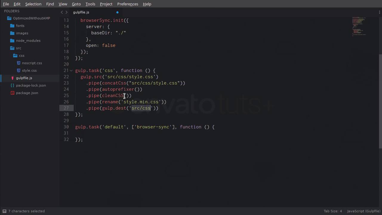 Hey, welcome back to Optimize Your Website with that end and the last lesson we got the basics of a project set up. We got node going, we got gulp going and we got your gulp file setup as well as getting the plugins that you need installed and ready for use. In this lesson, we're going to set up the CSS processing for our side. So I mentioned there's a couple of things we want to achieve with our CSS are on our checklist. We want our CSS to be in line, in our head section, but we want to work on our CSS as an external file. And one of the reasons you want to do this when you're optimizing is we're gonna stick with the 50 kilobyte maximum limit for our total CSS. So when you can see your files separately, it helps you to keep an eye on roughly what size they are. We're also going to be compressing our CCS files, we're going to by minifying them to strip all the white space out. So your separate files are going to be a little bit bigger in file size before they're meta filed like that. So you have a little bit of wiggle room compared to what you see as your file size read out. Right now what we're gonna do is set up a new folder. And we're gonna name it src for source because we're gonna be rushing our code into files that we'd put inside this folder and then we're gonna take a look at that code and basically smash it together into our actual live site. So all about source code or source files that we're working on, will be inside this folder. In here we're gonna work on some CSS, and we're also gonna work on some HTML so we'll separate those, by creating a new folder for CSS. And now in here, we're gonna create two files. We're gonna create one, called style.css. And this is going to contain all of our regular css for starring the page. And we're also going to create another one named no script.css. And we're going to use this one later, to help provide our JavaScript fall backs. All right. So now we've got our file set up and our folders all in the right place. We're going to go back to our code editor. So now we can see, we've got our source folder here and our CSS files inside. So now we need to set up a couple of tasks to handle these CSS files. And once again, I'm going to copy and paste the code that we need, and just talk you through it, so you're not spending too long watching me type. And this first bar of codes here is gonna process our main star shade here. So I'll take you through what we're doing here. First we've set up out gulp task and we've named it CSS. So if you wanted to just run this task by itself you'll type gulp CSS in the terminal points to your folder. And then this line here is telling gulp what source file it should be processing. And we're telling it to grab the filename style.css that's in the src/css folder, so that's this one. Then we're running the concat plugin on it, and what that is gonna allow us to do is when we're coding up our style sheet we can use at import to reference another style sheet and then go we'll fetch all of the CSS from that other style sheet. And it will transplant that content directly into our main style sheet. Then we're running the code through auto-prefixes so if there are any browser prefixes that are needed on the code that will be automatically included. Then we're running it through clean CSS and that is gonna suck out all the white space and compress our CSS file down to the smallest size possible. Then we're taking the code that we have so far, and by default it would just be pushed out with the same file name as we specified up here would just be pushed out style.css. But we wanna give it a different name, we wanna call it style.min.css. To let us know that this is the new minifide version of our file. And then we're telling gulp the destination that we want to right, and a new optimized style into, and that is the source folder, and the CSS sub folder, so we're going to be putting it back in to this folder here. Right now we'll save that and then let's test out this task. All right, so now if we type in, gulp css, it´s gonna process that file. And there you go, there´s a new style.min.css file. Now we need to do the same thing for our noscript file. So we're gonna add in another task. And this one is gonna be called noscript_css. It's almost the same as our first CSS task. So we're grabbing our source file, which in this case, is the noscript.css file. We're adding any vendor prefixes that are needed. We are minifying it. Renaming it to noscript.min.css and then setting a destination for the new file to our css source file. The only thing that we're not doing here is using the concat plugin because we're only going to be putting some simple code into our no script file so there's not going to be anything for it to concatenate. All right. Now let's try that task as well. So this time, we'll type Gulp in no script_css, and there's our new minified no script file. Now there's one more thing that we want to do as part of getting our CSS set up, and that is we don't want to have to be manually running those tasks every time we change our CSS file. We want Gulp to do that for us automatically. So inside our default task, we're gonna set up some file watches. We're gonna tell Gulp to watch our starter CSS file and note script.css file and whenever the change we want gulp to run these task for us. So we're gonna make that happen by adding these two lines of code. Just turn that a little. So we're using gulp watch and this is telling gulp just to watch our files. Here we're telling it which file to watch, so we're telling it to watch sstyle.css file. And then whenever it changes we're telling it to run the css task. So that's just gonna happen automatically for us. And then it's the same thing here we're telling gulp to watch our noscript.css file and to run the noscript.css task, whenever it changes. So save that and now, let's run a gulp default task and we'll just test what we've set up. So just gonna run gulp and let it spi