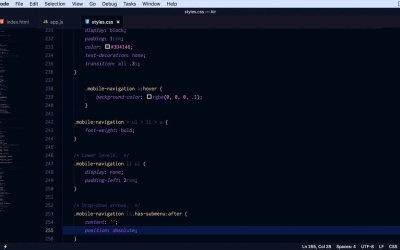Welcome to this 5th lesson of this short course. Now, is time to start working with more complex menus, like the ones with a lot of menu items, and the ones that have sub-menu. So, I prepared an example, here is the initial one that I showed you that has some menus. And what I did was basically duplicate this menu into a div_ class of mobile menu, which we'll use to create a simple off-canvas component. The idea is the following, on small screens Yeah, we have this menu button. When we click it, this menu that you see here is gonna slide in from the right side. Click it again, it's gonna slide back out. So, I already went ahead and added some styles for the mobile menu. And also, on our media query, just hiding the menu and showing the menu button. Let's begin by styling the mobile menu. We want it to be white; let's give it a padding of six rims on the top, zero on the sides, two REMs on the bottom. I'm gonna set this position to fix, I'm gonna give it a width of 20 REMs, set the top to zero, and set right to minus 100%. This will essentially move it off screen, by -100% which is it's width. And then, to hide it back out, I'm gonna add it to show it back or to slide it in. I'm gonna set a transition for the right property .3 seconds, set a z-index. I want to make the mobile menu appear on top of everything else, at a height of 100%, and then let's add the visible class. So mobile menu visible, I'm simply gonna set a right to zero, let's give it a go, There it is. Now, because we set a position to fixed and a height to 100%, it may be possible depending on the content that we don't see all of it. All of the content inside that menu, so a simple way to fix that is to add an overflow, to scroll. That will essentially add a scroll bar inside the menu, allowing us to scroll inside independently from the page. Now, let's add the styles for the mobile navigation. And the mobile navigation is simply the class that I added for the actual cloned navigation. So, we're gonna say mobile navigation a, we're gonna set it to display block. Remember, we have to treat this a little bit differently now, because we have submenus, and that we're gonna have to slide in and out, we're gonna set a color to 3D 41 and 46. A text decoration to none to get rid of the underline, and let's add a transition for all properties .3 seconds. These are just tiny details. The actual pattern we've already created. It's the slide-in off canvas. But, we might as well style this properly. Let's add a hover state to the A, so A hover, let's add a background color, very very light gray. Like this, and then, let's put a stronger emphasis on the first level menu items. To do that, were gonna say mobile-navigation immediate children you u l l i a, font weight, bold, so this will bold only The first level menu items. The rest are basically sub menus. Let's go ahead and hide those sub menus. So here, we're gonna say lower levels. And we're gonna say, [COUGH] Mobile Navigation liul. That's the structure that we have here. Each sub is a ul inside a list item. So that's what we're targeting here. Simply set a display to none, and also a padding left of tour end. Just so, it's pushed to the side a little bit. We can also add some drop-down arrows. And that's actually really simple to do with CSS. We're gonna say Mobile Navigation liul, with a class of has submenu, we'll create an after pseudo elements. We're gonna set the content to none, position, absolute. This is an element that we're gonna position absolutely inside each list item. And that actually reminds me that we need to set Mobile Navigation l i. Position relative, otherwise position absolute will just position that element according to the body, instead of the list item, which is not what we want. Let's set a top to 1.6 REMs, and a width and height to zero. This is really important, setting the width and the height to zero, because we're gonna create these arrows using borders, okay? So Im gonna say, right one rent, positioned on the side,.and then to create an arrow pointing down. We're gonna set a border left and right to five pixels, solid transparent. And then the border top, which is the opposite of the direction we want the arrow to point to, same value, five pixels solid. But here, we can specify the color that we want. In my case, 25% black should work just fine. And that basically, adds drop down arrows. And if we click those menu items, you can see that they now toggle, the correct submenus. So, how is this possible? Well, I kinda cheated on this a little bit, and I went ahead and wrote the JavaScript. So, let's go with line by line. When I click the menu button, which is this, what I'm doing is basically, toggling the class of visible on a mobile menu. And then toggling the class of visible on the dark overlay element that we haven't styled yet. But, bear with me on this for a little bit. Then, when I click one of these element that has a submenu, what I'm doing is that I'm getting the anchor type that was clicked. I'm finding the parents and I'm tangling the class of opened. And the class of opened will simply allow us to style this arrow. And then I'm finding the sibling list, and I'm just doing slideToggle. The sibling list is this one basically, so when I click on How-To Tutorials. And basically slide toggling this ul right here, which contains the submenu. So, couple of finishing touches here, let's style that opened class, that's actually very simple to do. So list item has submenu, opened after and all I'm gonna do here is simply set a border bottom. To display the color and set a border-top to none. And by doing that I'm essentially inverting the arrow, just like you can see here. Now, the overlay that I was talking about will be set on the main page basically, highlighting this menu. So let's go ahead and style that quickly, dark overlay. I'm just gonna fast forward here a little bit, because it's essentially the same style that we use on the full screen na
