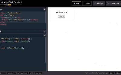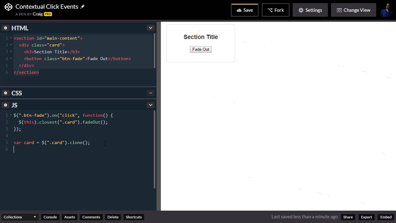 Hello and welcome back. Click Events are very easy to create in JavaScript. For example, we could very easily create a Click Event that will cause this section to fade out. And we're gonna do that in just a moment. But sometimes you'll come across an issue with your click events not working because a button has loaded after the page has finished loading. For example, let's say that you're building an e-commerce website, and you want to pull in a list of products from a database. So your page initially loads, and then after your items are loaded from the database, then those items are added to the screen. Along with the add to cart buttons that are associated with each of those products. And when you do something like that you might find that your click events no longer work because when you initially created those click events those buttons didn't exist yet. Well, in this lesson I want to recreate that issue in JavaScript and then show you how we can fix it. Now we're not actually gonna be loading anything from a database here. We're gonna keep it pretty simple just using JavaScript. But you can see on our screen here that we have a simple Fade Out button, and when we click on that, I want it to fade out this section here. Now you'll notice in our HTML, we have a section element with an id of main-content. Inside that we have a div with a class of card, which contains a h3. And a button. And when we click on this button, we want this entire card div to fade out. But if you're loading multiple products, for example, you might have a series of these cards that are added to your screen. And we wanna make sure that our click events are going to work for those cards. So you can find the URL for this starting pen in your course note for this lesson, once you open that up go ahead and click on fork to create a new copy of it and all the changed we make will be saved in this new forked version. So you can take a look to your CSS and see how that card is styled but we're going to jump into the JavaScript now and make this work. So first of all, I wanna create the fade out. So, whenever we click on this button, which, by the way, has a class of btn-fade, whenever we click on that, we want this whole section to fade out. So, first, we're gonna point to the button itself. So we're gonna create our JavaScript or jQuery selector, excuse me. And we're pointing to the BTN Fade class, so we're gonna say dot, btn, hyphen fade and then we're gonna create a click event here. So we're gonna say on, click, and we click on that we're gonna run a function. Let's go ahead and nudge those closing curly brackets and parenthesis down semicolon to end our statement there. And then inside that click event we want that entire section to fade out. So, first of all let's point to the button by pointing to dollar sign and then inside parentheses point to this. That will point to whichever button we just clicked on. And then we want to find the card element that contains that button that we just clicked on. And I'm gonna do that using jQuery's closest method. And the way that works is after our selector here we're gonna type dot Closest and then inside quotation marks here we need the CSS selector for the item that we're looking for. The element that we're looking for. We're looking for the closest element with a class of card applied to it so m gonna type dot card here. So when we do this dot closest card this again is pointing to the button itself. And the closest card element is the one that is containing that button. So once we find that card we just want it to fade out so after our closing parenthesis there we're gonna type .fade and then out with a capital O. Open and close parentheses and a semicolon to end our statement. So this should work just fine. If we click on the fade out button, we see that that section fades out just like we expected it to. Well, I'm gonna reload that. I'm gonna right click and click on reload frame and we should see. Popup again, and we do. So now I want to simulate what would happen if we had some buttons that didn't load until after the page was finished loading, for example if we were to load them from a database, and then populate the screen with these products that have an add to cart button or whatever the button is that you're looking for. So the way I'm going to duplicate this is I'm gonna create a variable called card. We're gonna create a new instance of this card dev basically by cloning it. And we're gonna use the jQuery clone method to do this. So for our card we're gonna set this equal to a clone of our card class. So, I'm gonna point to the element of the class of cards. So, we'll do that here .card and then we're simply going to say dot clone, open close parentheses semicolon to end our statement. So basically we've created another copy of this .div with a class of card and everything that's inside of it that we've stored in this variable called card. Well, now I want to append this new copy of it to our main content section here. And that's very easy to do. First, we need to point to our main content section. So we'll create our jQuery selector here. And then inside quotation marks, we're gonna point to that main content ID. So #main -content, And then we're gonna say .append. And then what are we going to append to it? We're going to append that card element that we just created, and we'll put a semi colon at the end of that statement. So now we can see this new card has just shown up because we created a clone of that div and then we appended that new clone to our main content, so now we see two of them, but now we're going to see a little bit of a problem. Our first one here at the top should work just fine. We created our click event for a div that was already there on the screen. So, if we click on Fade Out, we see it fades out just fine, and the second one moves up into its place. But our second one wasn't created until after that click event was created, so if we 