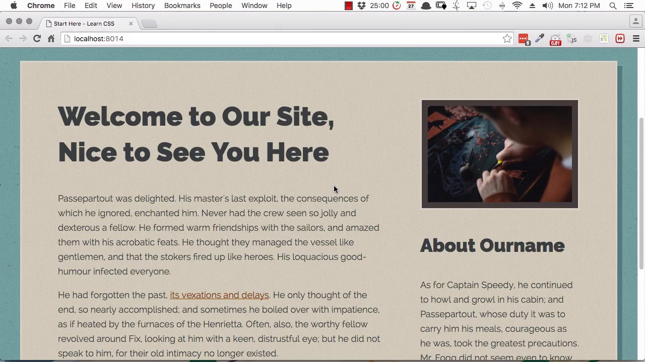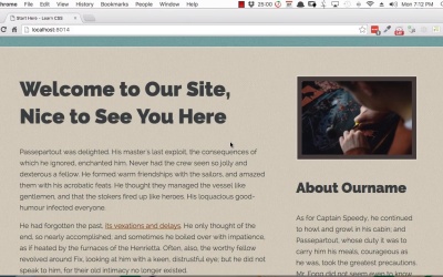 Hi, and welcome to the final lesson of Start Here, Learn CSS Colors and Backgrounds. In this lesson we're going to use some CSS3 shadow effects to add a little bit of extra dimension and a little bit of extra polish to our coloring process. There have been a few different versions of CSS. We started with CSS1. We went through CSS2. Right now, we're in the middle of CSS3, which is almost fully supported across all popular browsers. We're starting to see what's gonna be coming next in CSS4. CSS3 put in some extra cool things that you can do that previously you needed to work with flat images for. One of those things is drop-down shadows. There's two types of shadows that we're going to be working with in this video. The first is a box-shadow and the second is a text-shadow. A text-shadow can be put on any text, as the name suggests. A box shadow is designed for using on square elements like divs. We're going to start by putting a box-shadow on our wrapper element. We'll add in the property box-shadow. There are a few values that you need to put into your box-shadow property. The first two let you define the offset of the shadow that you're creating. The first value is the x-offset, which is on the horizontal axis. The second value is the y-offset, which is on the vertical axis. You'll see what we mean by offset once the shadow's in place in a little bit. So for both of these values we're gonna enter 0.625rem. Here you also have the option to add a value for blur and spread. Blur is how softened you want your shadow to be and spread controls the overall size of your shadow. We're not gonna be using those properties for our purposes, but I'll include a link below where you can read a little bit more about them. Because we're not going to be using those properties, we can skip to the last property, and that is the color of the shadow. Now here, we're gonna be using an RGBA value. You remember from our first video in this course, we talked about how RGBA color values allow you to create see-through colors. That's perfect for our shadow because we'll be able to have a shadow coming off our wrapper with the background image showing through it. So we'll add rgba with a set of brackets, and we'll just add a semi-colon to close off our line. And now for the color, we're going to add 58 for the red value, 89 for the green value, 87 for the blue value, and 0.5 for the alpha value. Now save that and we'll expand our windows so you can see the shadow. And there we go. Now we have a shadow running down the right side of our wrapper. If you look closely, you'll see that the image is showing through that shadow. Then we also have the same shadow running along the bottom. The way the shadow is generated is a box the same size as the element we've applied it to, in this case our wrapper element, is generated. Then it's offset by the amount that we specify in the first two values of our shadow. So that's what we mean when we refer to offset. The shadow is created and then it's just moved, or offset. Then it's given the color that we specified in the last value of our shadow. So that just gives us a little bit of something extra to help add dimension and style to the sign. Now we're gonna do the same thing to our headings here. This time we're gonna use the text shadow property. For this one, we're going to create a new class. We're going to call it heading_shadow. Now before we move on, we're just going to add this class to our two headings. In the html for h1 here, we're gonna add a class= heading_shadow. And then we'll do the same thing in the heading for our sidebar. Back in our CSS, we'll add the property text-shadow. What we're going to do with this effect is we're actually gonna create two shadows and have them stacked one on top of the other. That's one of the cool things that you can do with CSS shadows. You can actually have as many shadows as you want. All you need to do is create a list of values just like we did here with our box shadow. Then add a comma, and then after that you can add another list of values just the same. What you'll end up with is a number of shadows stacked one on top of the other. You can create a lot of really cool visual effects with this. What we're gonna do is to create a subtle, dark-colored shadow underneath that text. But on top of that, we're gonna have another shadow that's about the same color as the background. That's gonna make it look like there's a gap in between the letters and the shadow that's underneath them. Let's go ahead and set that up. First, we'll put in our darkly colored shadow. We're gonna set the x-offset for this shadow to 0.125rem. We're also gonna set the y-offset to the same amount. We're gonna set the color with the hex code ABA076. We'll save that. So there, now you can see we've had our shadow come up on our heading text. It's a version of the color of our background, but it's a little darker to try and make it look like a natural shadow. Now we're gonna stack a shadow on top of them. When you're creating multiple shadows, whichever you put first in your list is gonna come up on top. We want to add a shadow that's gonna come up on top of the one that we've already added. So we're gonna put this in front of the shadow that we've already created. We'll just add a comma before this and a space, and then before the comma, we're gonna add in our new shadow. This one is gonna have a smaller offset, so for both the x- and y-offsets, we'll put 0.0625 rem. For the color, we use the hex code D0CBB8, and now we'll save that. Now when you look at the shadow, you can see that that's changed the effects. We've put a smallest shadow on top of the one we'd already created, and that shadow is about the same color as the background. And because we put that shadow first, it partially obscures the shadow that's behind it. The same shadow effect is also applied to the sidebar heading. All right, so that's it. You've now completed the coloring of your website. Y