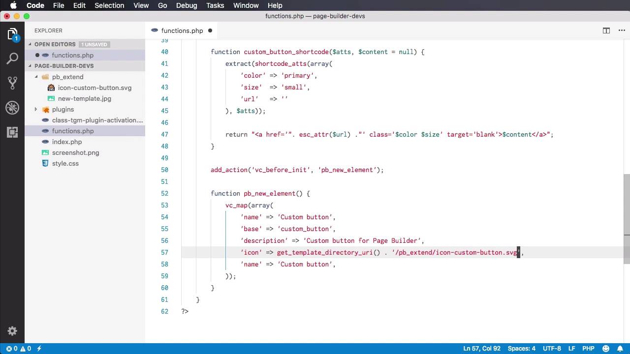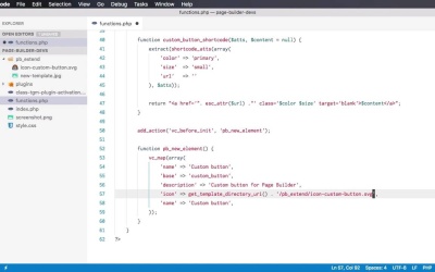 Welcome to the third lesson of this course where you learn how to add custom elements to the Page Builder plugin. It's relatively simple, so let's begin. Now the first thing we're gonna do is do a check to see if the plugin is indeed loaded. If it's not loaded we cannot proceed because it will essentially crash your WordPress installation. So a simple way to do that is to say if {function exists{'vc_map'}} { then we proceed. So vc_map is a Page Builder function, and if the plug in was installed and activated correctly, then this function is available. If it wasn't installed, then this function is not available. So there's no point in continuing if we don't have a working or an activated plugin. So let's add a custom element. We'll start by defining new shortcode. We're doing this because essentially, every Page Builder element is a shortcode. So to add a new element, we need to add a new shortcode, we're gonna say, oops, add_shortcode(). Let's create a simple shortcode, for example a custom button. And we also have to specify the function that is responsible for outputting to the frontend. So we're gonna say custom_button_shortcode, but you can name this function in any way you want. So let's create that, custom_button_shortcode. It receives an atts parameter, or attributes, and the content which we're gonna initialize as null. If you've created shortcodes in WordPress before, then this shouldn't really be a problem. All right, so what we're gonna do is specify a couple of parameters for the button. We're gonna give it a color, a size, and a URL. And also the content will represent the actual text that will be displayed inside the button. Let's do an extract function to make all of these properties available as individual variables. So I'm gonna say extract(shortcode_atts(array(. So we're gonna have the following attributes, color. Let's give it a default value of primary. And we'll also have a size with a default value, let's say, of small, oops, and also a URL with a default value of blank. So these are our default values. Now if you're still not familiar with creating shortcodes, let me explain this a little bit. This function right here will basically merge an array of default values with the attributes that we're receiving when we write the short code in the backend. So if, for example, in the back end, I write the short code like this, custom_button, and I go ahead and specify color =, I don't know, secondary, and size = large. What this is gonna do is, it's gonna pass in color secondary and size large in the atts or attributes array to this function. And then the short code atts function will take the attributes that I passed here. And it's gonna compare them with the default attributes that I have here. So if for example, I wouldn't specify, let's say, size. The function will use the default value, but since I'm specifying a color, this secondary value will override this primary value. The URL, since it's not specified here, will be taken from the default values which is currently none. This value right here, Click me, is the content, so that's essentially how short codes work. Now once we extract those values, and essentially extract, what it does is it creates variables called color, size, and URL. And I'm doing that because I want to write simpler code right here. We're gonna return. This will basically create the output for the shortcode or the stuff that's gonna be displayed on the front end. So I wanna display an a href =, and we're gonna pass in the URL but we also have to sanitize it first. So we're gonna say a href, we're going to say escape. Or let's do escape attribute, or attr, and we'll pass in the url. And then for the class, we'll give it color and size. And we'll also set a target to blank, and then inside we'll paste in the content. All right, so let's test our new shortcode and see if it's working. So I'm gonna go back to my backend. Currently, we're not using Page Builder. So for text, I'm just gonna say custom_button, let's say go to envato. And I'm gonna specify the url right here as envato.com. Let's give it a size, let's say, large, and let's give it a color or no, without the color. All right, so let's hit Update, and let's take a look at our page. And there we go, we now have a link that says Go To Envato. If we inspect it, you will see that it has the classes of primary, which is the default value of the color attribute we set in the shortcode definition. Large, which is the value of the other size attribute. We specified the href correctly, and the content of the shortcode is Go to Envato which is the button text. I currently don't have any styling for it, but that's beyond the point of this exercise, so the shortcode works. Now, let's go ahead and add that shortcode as a new element in the backend editor. So the new element will simply appear here when we click + it's gonna show up on this list. So how do we do that? Well, first thing we have to do is say add action(), we need to tap into one of the plug-ins functions. And that function is called vc before init. So before it initializes, we're gonna execute our own function which is called pb_new_element. Again, you can call this whatever you want. So I'm gonna create this function, function pb_new_element. And inside, we're gonna use the vc_map function. So the vc_map function receives an array of values that describe this new element that you want to create. So there are a couple of options available for the particular element. In our case we're gonna use just a few. We're gonna start with a name, right? The name is gonna be Custom button, and this will be displayed in the backend, in this list right here, just like you can see Accordion and Pageable Container here, Custom button will be the name of our new element. Then, the base, this is the name of our shortcode. In our case, it's Custom button. Then you can also add a description, which will also appear here. In this case, it's vertical tabbed co