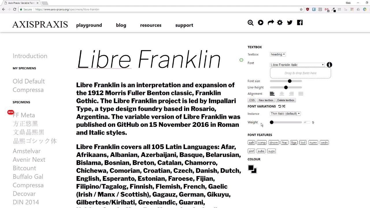 Hey, welcome back to Up and Running with Variable Fonts. In this lesson, we're gonna go through the first of the four high level properties you're gonna have to work with variable fonts. And that is gonna be font-weight. Unfortunately, for now font-weight is not actually ready to work with variable fonts. So, we're just gonna comment that out, for now, to remind us ehat we're actually looking at and instead we're gonna use font variation settings. As we mentioned before, if we want to use font variation settings, we need to target a four letter label that represents a particular access. We're working with weight, so that's going to be W-G-H-T, then we add a space. And this is where we're gonna be able to put the numerical value that we wanna use to represent our font weight. I'm just gonna end that line for now. Now, you're probably already used to a certain set of numbers that typically represent normal weight or bold weight or extra bold, black, etc. And before I started this lesson, I did remove the extra weight control and italics that I had on here before. So, make sure that you just have these lines and this, before you move on, because that is gonna give you the default look of the Libre Franklin font, and that's what we want. And the first thing that we're gonna do is, set this font, so that it's gonna show us the regular font weight. If we have a look at this font on Google Fonts, this is what regular should look like. And normally, if you wanted to set a font to be regular weight, you would set as font weight to 400, that's the standard size. Now, if we take a look on the Google font version again, just gonna select this font and then in the customer's tab you can see here that sure enough regular is usually represented by 400. So, let's try applying that value and see what happens. We're gonna set the weight to 400, we'll save, have it up to look. And nothing has changed, so that's very strange. All right, what happens, then, if we go with a different weight. Maybe, we'll try setting it to bold, on purpose, we'll set it to 700. Change that to 700, and, weird, still nothing's changed. All right, so now, let's try a lower number instead,let's try 100. 100 should represent super thin weight, change that to 100. Okay, well now it's thinner, but it's definitely not as thin as that, so what's going on here. This is what we have to remember, that the value ranges on the axis of variable fonts, at least for now, are completely determined by the font designer. So, if you're punching in numbers and you're wondering why you're getting no change, then what you're gonna have to do is, go to one of your variable font preview tools that we talked about earlier, like Axis-Praxis. And then, you're gonna need to look here to see what range you actually have to work with for the weight on this specific font. So, if I click to select this text, if I drag all the way to the left and you look at this little box here. It's a little small, but it says 40. So the minimum weight on this font is 40. And if I drag up, This number now says 200. So, the maximum weight you can actually have on this font is 200. So, when you start adding in values like 400 and 700, those are so far outside the range that all they do is clamp that weight down to the highest value, which is 200. And that's why when we added in 400 and 700, it still just looked fat and chunky like this text here. And it's also why when we put in 100. Our text became smaller, but not super small, like we expected it to be. And this is, again, where we come back to the named instances being useful, even though we can't directly target them with our CSS. So now, what if we choose the regular? I'll just switch this to normal Libre Franklin for now. We switch to regular. What weight do we actually need to make our font look regular? And this number in here, again, sorry it's quite small, but the number that we actually need is 84. So now, let's change our font weight to 84 and see what we get. All right, now that's looking like the regular font weight. So if we compare it to Google Fonts, there's the regular font way. And what if we want it to be bold? So, we'll go to the named instance, we'll choose bold, we'll look up this number and the value that we actually need for bold is 154. So now, let's try 154 and see what we get. There we go, that's much better. That is the correct size for bold. So now, what we could actually do when we're setting up the CSS to work with this font is, go through each of these named instances and find the number. That gives us the correct representation for the weight, if we wanna use the standard weights that the font comes with and we can add them into our code, one at a time. So, I'm just gonna copy and paste in a bunch of code. You'll get access to this file, so you'd be able to open it up and look directly at it if you don't wanna go typing all this code up yourself. But what we can actually do, just gonna comment this out, is we can create a class to represent each one of the weights that we wanna use. So, this has each one of the correct values in as pulled from the named instances and then whenever we want a font to be light we add the light class. Want it to be medium, then we add the medium class. And we've also in here, added a class named italic that if we want our text to be italicized, we can just add this class to it as well. I'm just going to add some text in here down below, so we demonstrate this. So, I've got some text for each one of the weights that we have just recreated in CSS. So, we've got thin, thin italic, extra light, extra light italic, and so on. So now, let's see how that looks. And there we go, sure enough, we now have all of the correct weights for our font. Everything that we see here has being perfectly reproduced and this is actually the code that I showed you earlier in the course to demonstrate the difference in load speed. So, we have all of these different variations but we're onl