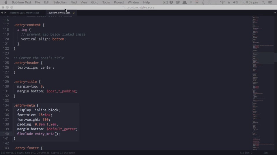 Hey, this is Kezz. Welcome back to WordPress Theme Creation with Underscores. In the last lesson you setup the main coloring of your theme and you also integrated some cool little icons. In this lesson we're going to add some extra coloring and polish to some of the finer elements of your theme. But the first thing we're gonna do is add some little dividers in between those list items that we just added icons to. Just as we did in the last lesson, we will do that by first adding in a couple of mixins. And, here we go, here we have our widget-divider mixin, and that will be the default divider, that goes in between each of the list items. And, a widget-divider-top mixin, and that's just gonna be necessary in some of our nested sublists. We'll apply those mixins by first adding our default widget divider mixin into just the regular list item for our widgets. And that will be the styling that's used on almost all of the list items. Then we'll also add our widget divider top mixin here. Now, these classes and selectors are applying to the first list item in any nested list, so any sub-list. And the reason we do that is if there's no line put at the top of one of these nested lists, you get a bit of an ugly looking blank space. Now, we'll compile that. And there you go. You can see our subtle lines in between our list items. Everything in this theme is designed to be quite subtle. So, you see these very soft colors and soft differences between one color and the next. And, you can see all throughout the list we have the default widget divider. And then at the top of our sublist here, you'll see that top divider. Now we'll add in some coloring that will affect the individual posts. We have a few different mixins that we're gonna be adding for that. First off, we have our entry meta mixin, and that will style that little section where you see posted on this date by this person, etc. Then we have a dotted link class, and that's going to give us a slightly different style to only the links within the posts themselves. Following that we have some styling for our entry footer. And that is where our list of categories, list of tags, and the icons that we just added in earlier are held. And then below that we have a styling for our comments on each individual post and we will apply those mixins in our custom styles file. The entry-meta mixin goes into the entry-meta class. The dotted link mixin goes into the entry content class. The entry footer mixin goes into the entry footer class. And the comment mixin goes into the comment class here. Those mixins turn our individual post style into this. And we've got out post meta here. We've got our new link styling here and our entry for the styling here. The comment styling gives our comments this look, and we're using a slightly transparent color so that when we have nested replies, each one will be a little bit darker than the last. As the transparent color stacks on top of the previous color. >> The last two mixins are adding, one for our sticky posts, because you should try to design your sticky posts so they stand out, looking a little bit different from other posts. We also have one to darken the color of the links in the site footer. And that's done just enough to make sure that the text color contrast ratio is sufficient for accessibility purposes. To implement our sticky post style link, we're gonna add this new class, sticky, and we'll add our sticky post mixed in inside it. Now all posts that are set to sticky status in WordPress will have the sticky class applied to them. And that means our sticky posts will go from looking like this, to looking like this. And finally, we'll implement our site footer mixin by adding it to our site footer class, and that just turns the links in the footer to this color. You might not even really be able to see the difference there but if you check the contrast ratio using a tool like accessibility developer tools for Chrome, for example, you'll see that they actually are brought up from not quite a sufficient contrast accessibility purposes to being just right >> So, that's it. Well done. You've just finished the just add style part of this course. So you've completely taken your basic underscores theme and you've turned it into a custom styled version. Now that said, even if you've never touched PHP before follow me into the next section where I'll walk you through some customizations to the themes PHP files that will really help you to bring your theme up a notch. So we are going to start by learning how to load your custom fonts in, in a much more efficient way. And we will move on to adding a touch friendly menu, featured images, excerpt support, and some new widget locations. I'll see you there.